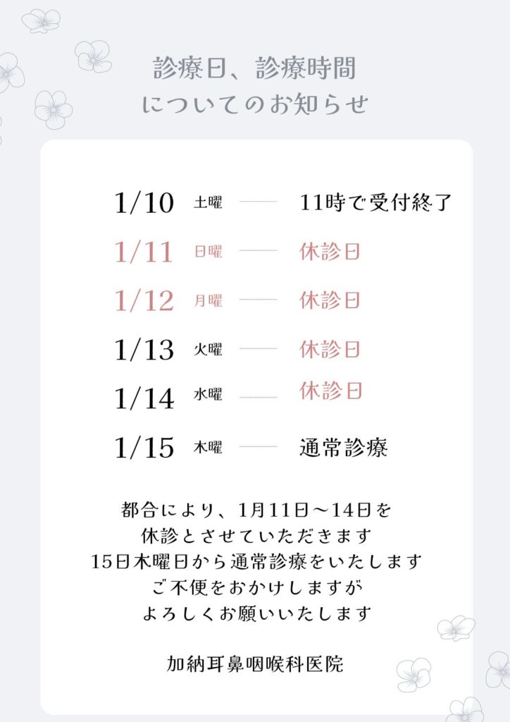 診療日、診療時間についてのお知らせ(2026.1.10~1.14)